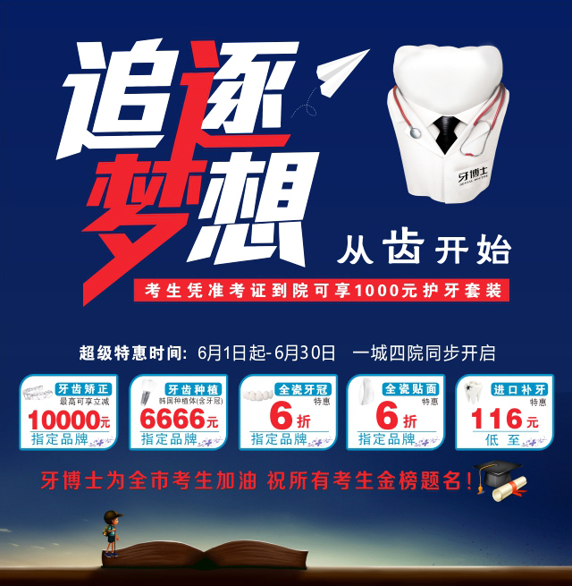 追逐梦想、从齿开启丨高考生凭准考证可享受1000元护牙套装 一年一度的高考即将到来 莘莘学子都在为梦想努力拼搏, 从牙牙学语到今天的备战高考, 十二年的寒窗苦读, 十二年的风雨兼程, 只为
