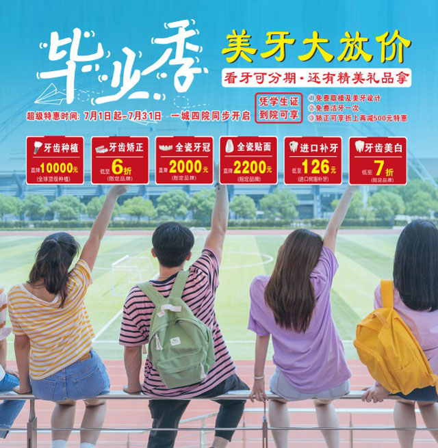 毕业季,美牙大放价丨关注青少年口腔健康,拥有健康牙齿,绽放自信笑 每年夏天,都会有一大波冲出校园的学生,他们期待又忐忑,怀揣着对大学或职场的憧憬。然而,在这个拼才华还要拼颜值的时代,改变命运的除了考学,还有我们的外貌!然而美牙一次,能让颜值爆升。值此,牙博士口腔开启“毕业季,美牙大放价”活动特惠,让更多的青少