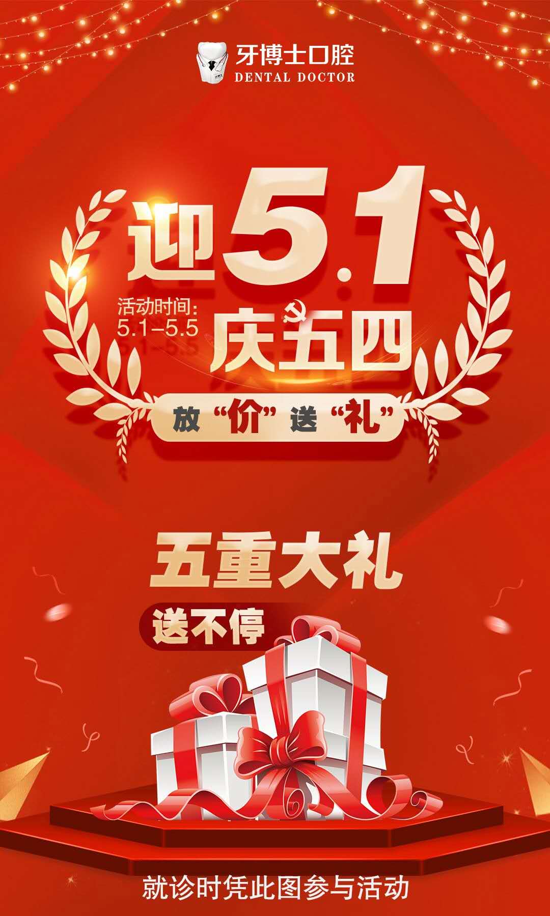 【牙博士口腔】迎 五一 、庆五四,放“价”送“礼”,五重大礼送不 健康是我们每一个人幸福生活的基础,口腔健康是影响身体健康的第一要素,为更好地帮助大家自觉维护口腔健康,树立正确的口腔健康观,并以实际行动来维护口腔健康。>>戳我,咨询优惠<< 牙博士口腔牢记“健康使命的担当” 心系每一