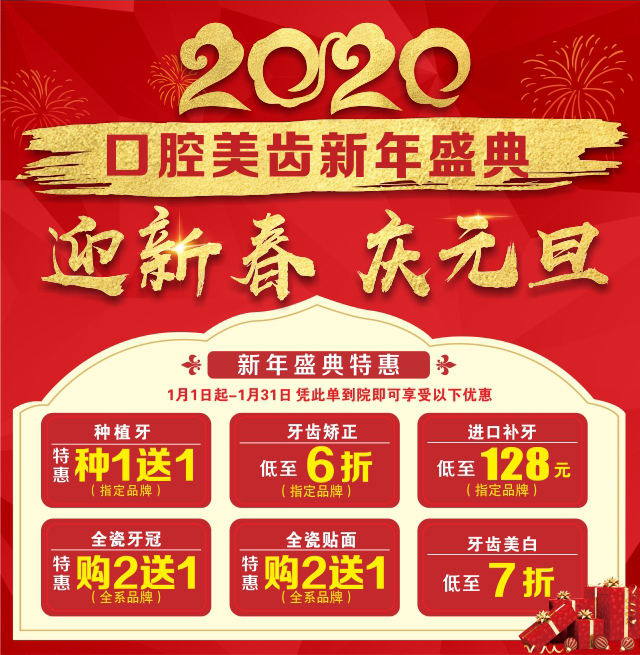 元旦已至,春节将近,正所谓新年新气象,给自己换个新面貌正在当下,而一口难看的牙最为影响形象,不仅影响身体和心理上的健康,更让人缺乏自信。值此2020新年到来之际,牙博士口腔迎新春、优惠不断,特开展“2020口腔美齿新年盛典”活动!!为满足广大市民对口腔健康的需要,你所期待的种植牙、正畸、全瓷牙冠、牙齿美白等全部都有钜惠!!